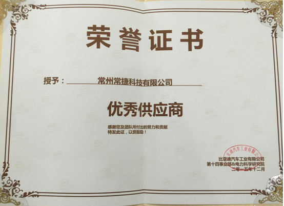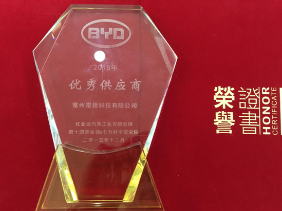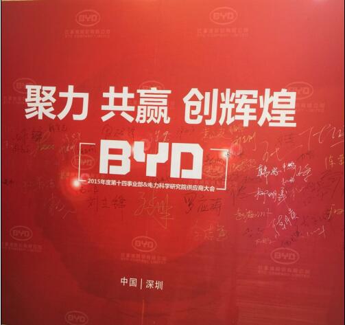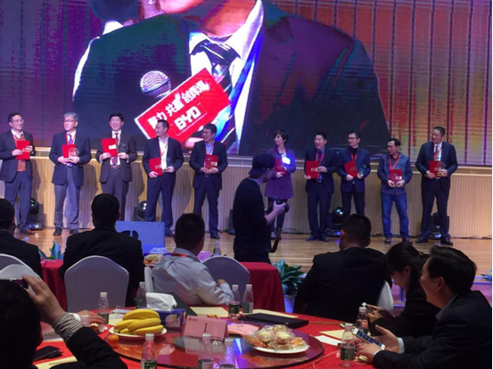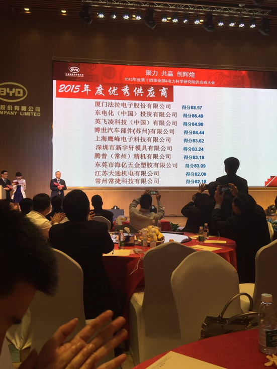 參加比亞迪汽車(BYD)第十四事業(yè)部&電力科學(xué)研究院“2015年供應(yīng)商大會”照片,并獲得“優(yōu)秀供應(yīng)商”榮譽稱號。